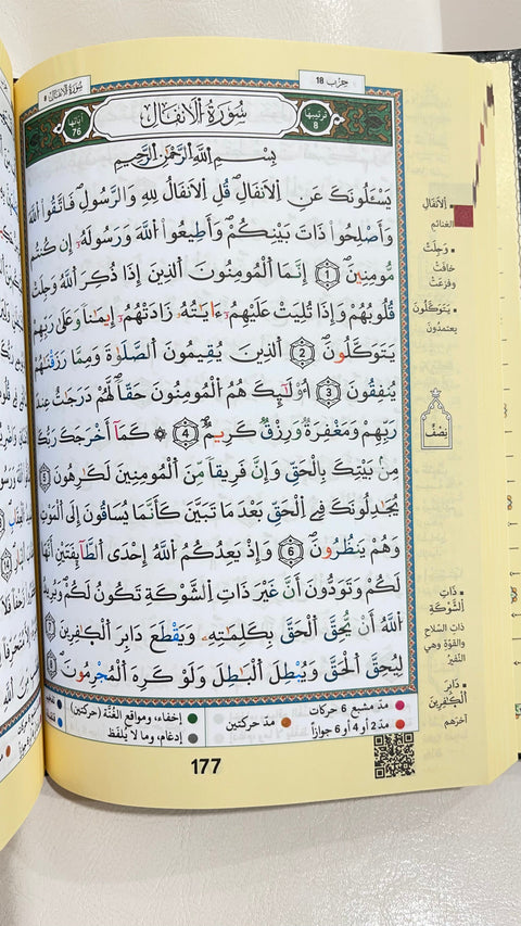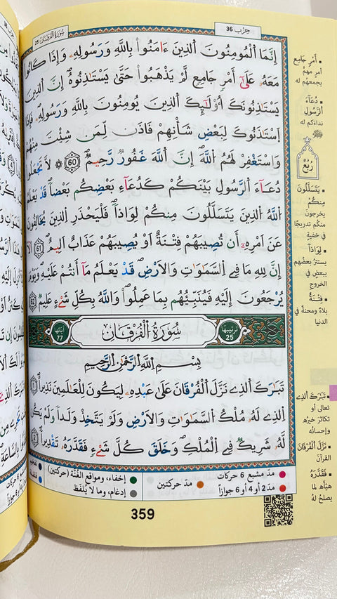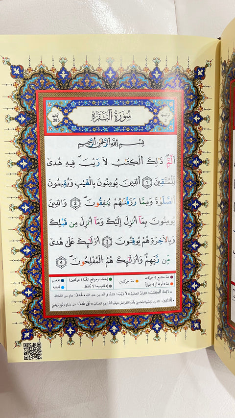 Sulla base di una comprensione pratica della fonologia, questo testo sacro alcuneettere sono state codificato a colori per facilitare la corretta recitazione del sacro Corano.