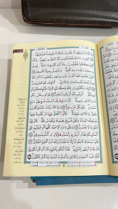 Sulla base di una comprensione pratica della fonologia, questo testo sacro alcuneettere sono state codificato a colori per facilitare la corretta recitazione del sacro Corano.