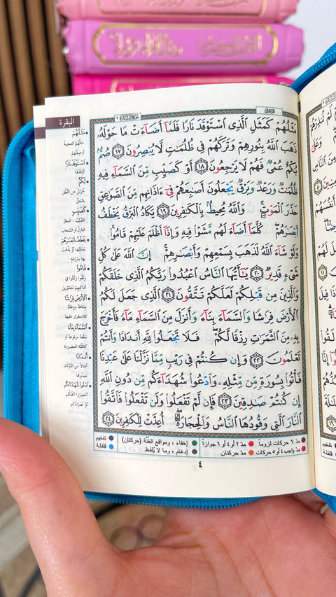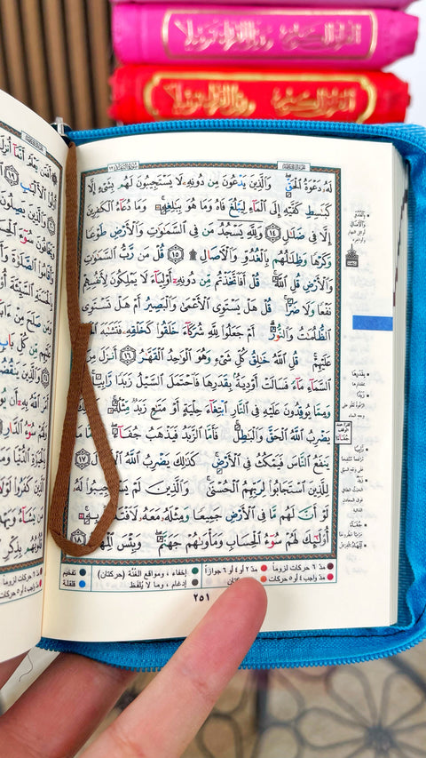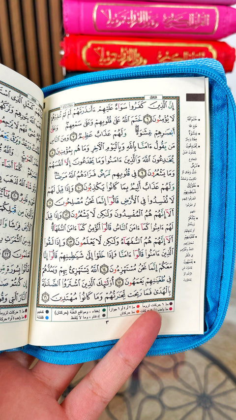 Sulla base di una comprensione pratica della fonologia, questo testo sacro alcuneettere sono state codificato a colori per facilitare la corretta recitazione del sacro Corano.