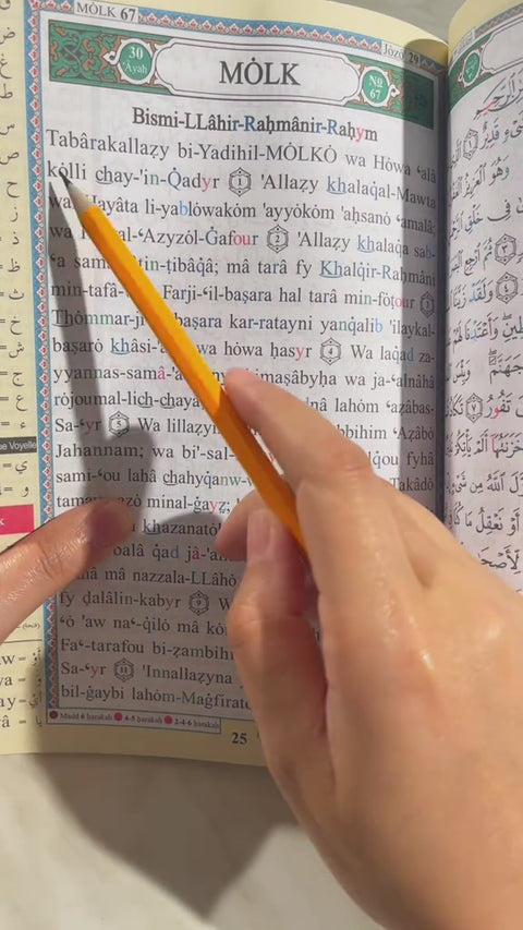 Questo libro contiene la trentesima parte del Corano:Juz Amma + juz tabarak + Qad sami’a traslitterati.